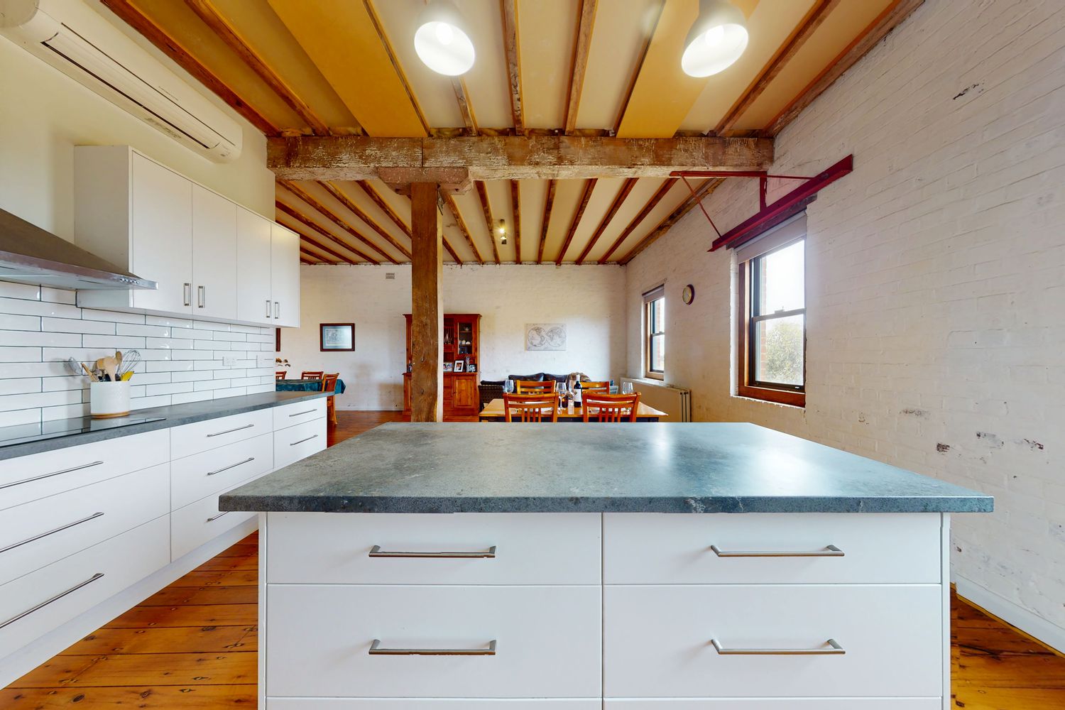 From the quadruple brick construction of the lower level and triple brick upstairs, to the massive timber beams and columns, oversized bearers and 38mm thick murray pine flooring, everything in this building speaks of its industrial heritage. Constructed semi-underground as a state-of-the-art wine processing and storage facility, it was in full production by the late 1890s, only to have the vines decimated by phylloxera like so many other vineyards in the area.